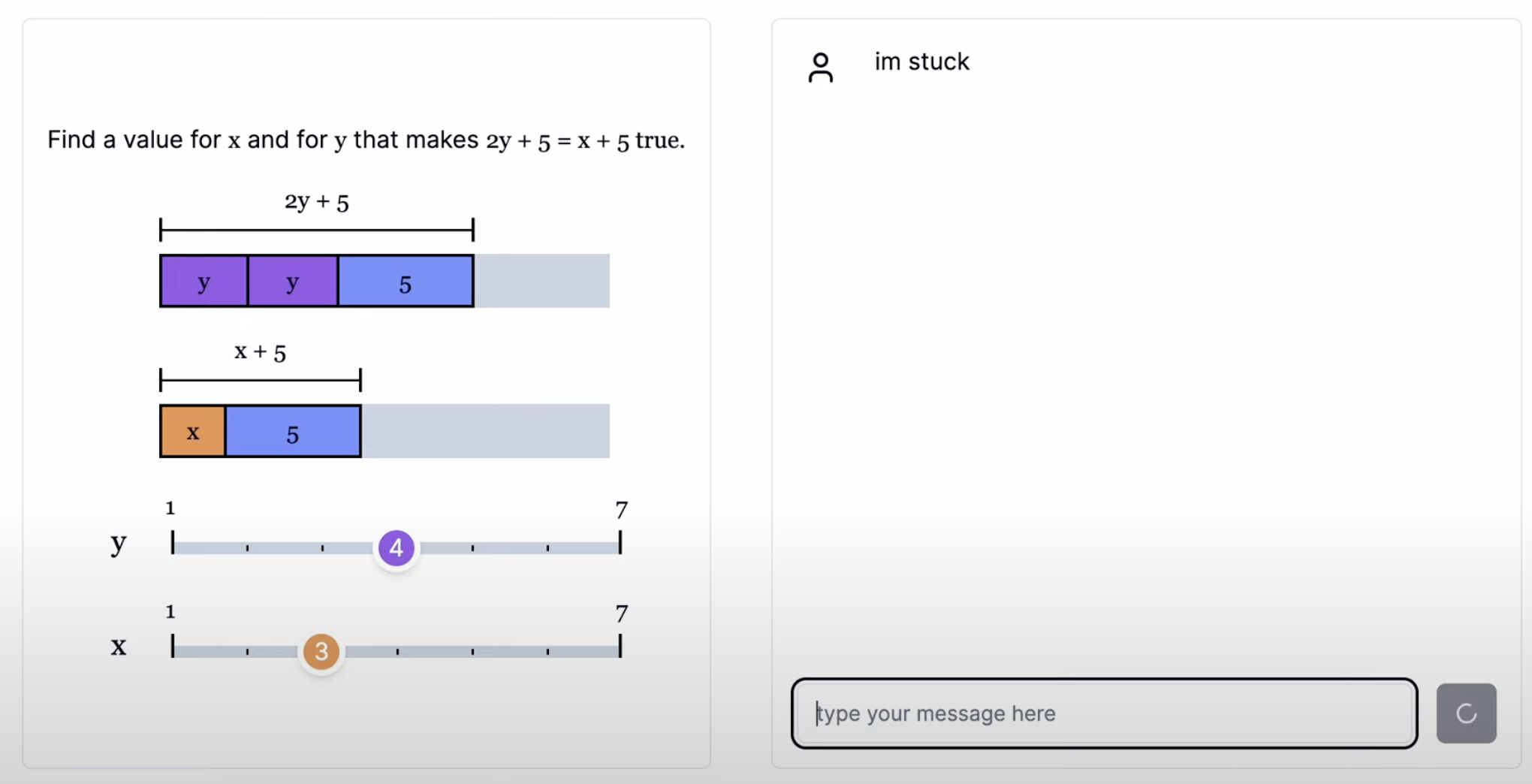 So I cloned the activity from this question where learners gain an intuition of balancing an equation with two variables by trying different values for and until the “size” or “width” of both sides of the equation become equal.