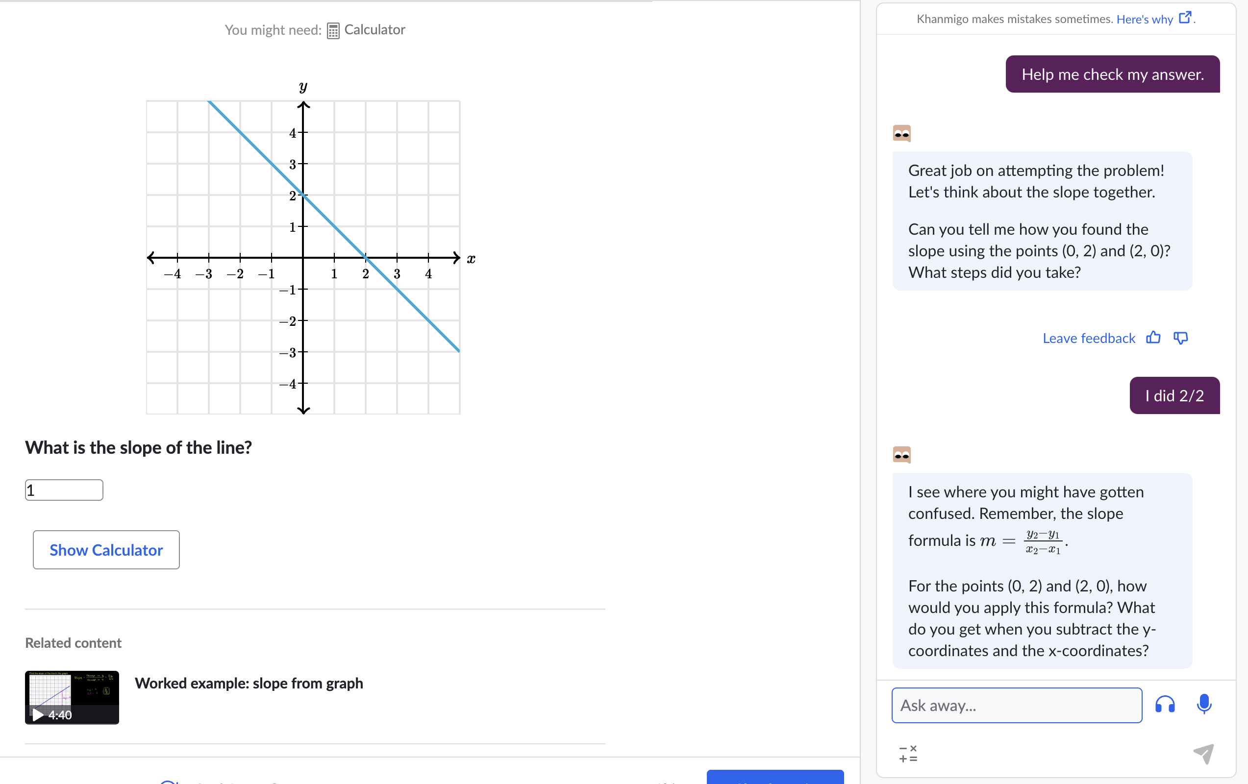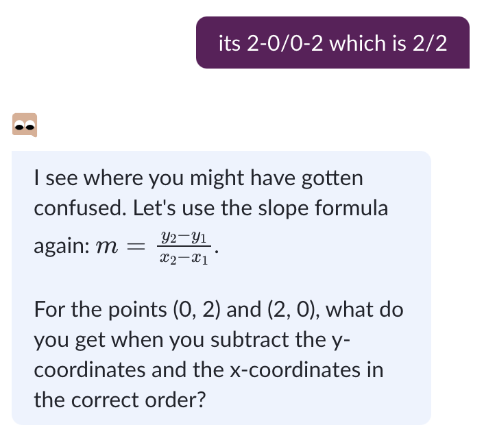 its 2-0/0-2 which is 2/2to see if it gets to the bottom of my fundamental mistake. - It replies with the formula again and asks me what I get if I subtract the coordinates in the correct order.